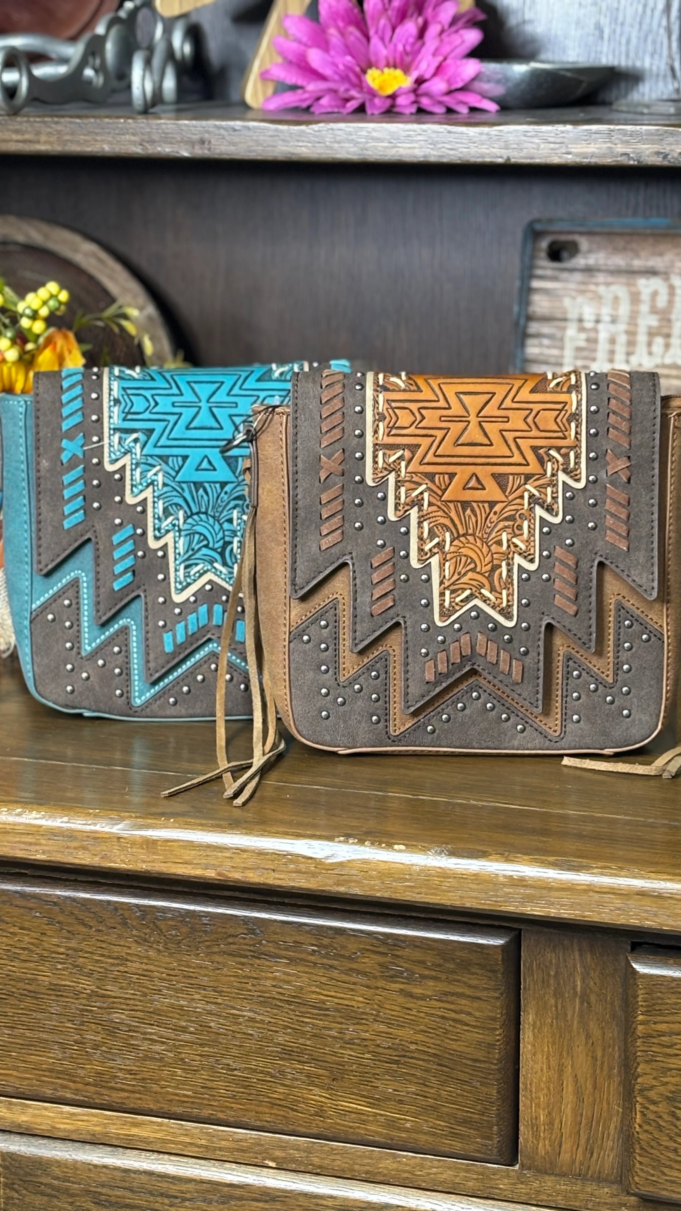 Aztec and floral tooled on the flap with magnetic button closure