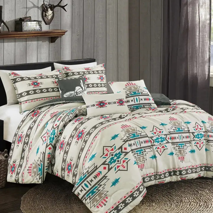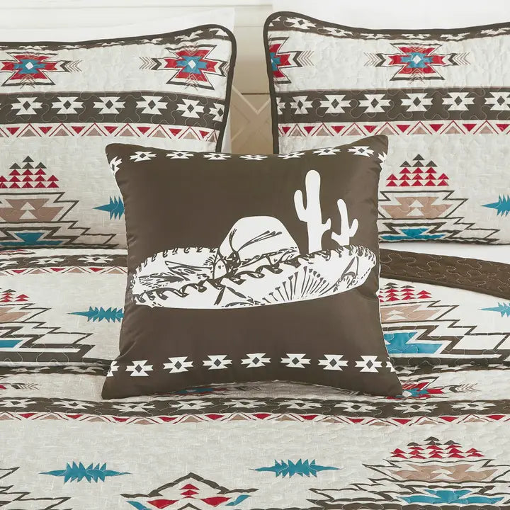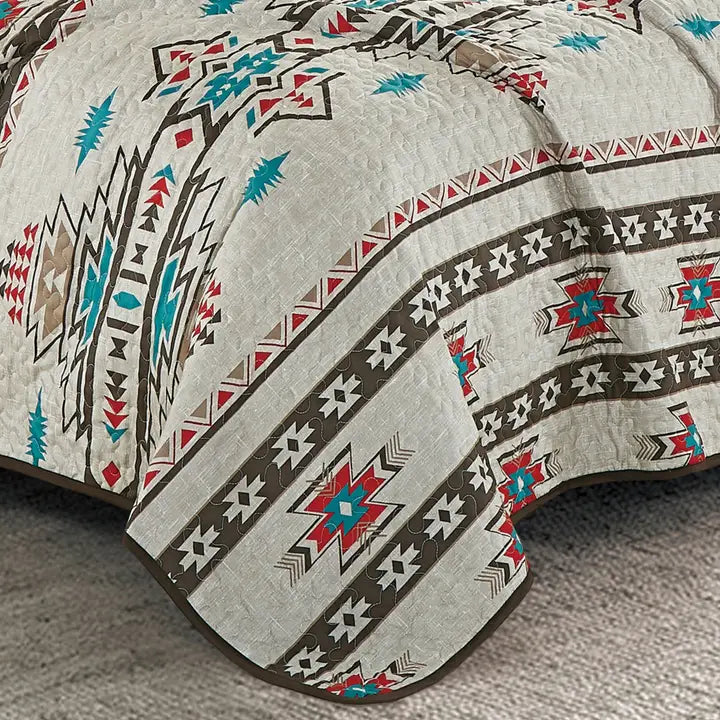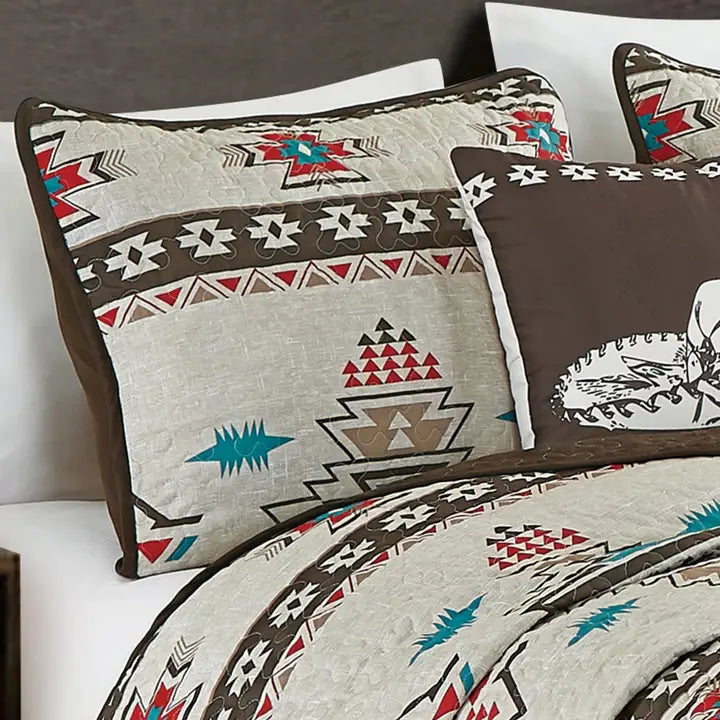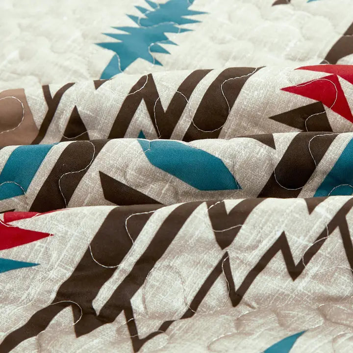 We envision your every want and transform it into reality. Each and every product is crafted with your satisfaction and pleasure in mind. This Lovely Southwestern style Aztec Quilt Set brings you warmth, delight and extravagance. High-quality fillers that are guaranteed to enclose you with a warm embrace are safely lodged in a quality cover that smoothly blooms to your touch. Linen Mart brings you an extravagant quilt set for an extravagant lifestyle! The 5 piece quilt set consists of a bedspread, pillow shams, a décor pillow and a breakfast pillow.