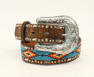 Make a timeless fashion statement with this Ariat Girl's Hair On Beaded Leather Western Belt. This belt features a charming hair on design adorned with rhinestones and studs and finished with an aztec beading pattern of turquoise, orange, black, white and red detailing, and accented with rhinestone conchos at each end. The removable silver buckle lends a polished finish to any outfit.