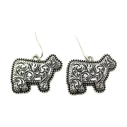 Channel authentic ranch style with these Western Etched Cow Dangle Earring, perfect for expressing western charm and rugged country aesthetics. Dimensions: Height: .5 inches Width: 1.5 inches