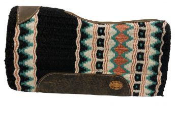 Klassy Cowgirl 28x30  Barrel Style pad with black multi color design with metallic rose accent memory felt bottom saddle pad. This durable woven wool topper features a black multi color design with rose metallic accent thread with reinforced leather spine and over sized top grain wear leathers with a 3/4" memory foam felt bottom. Pad is contoured to fit your horse.