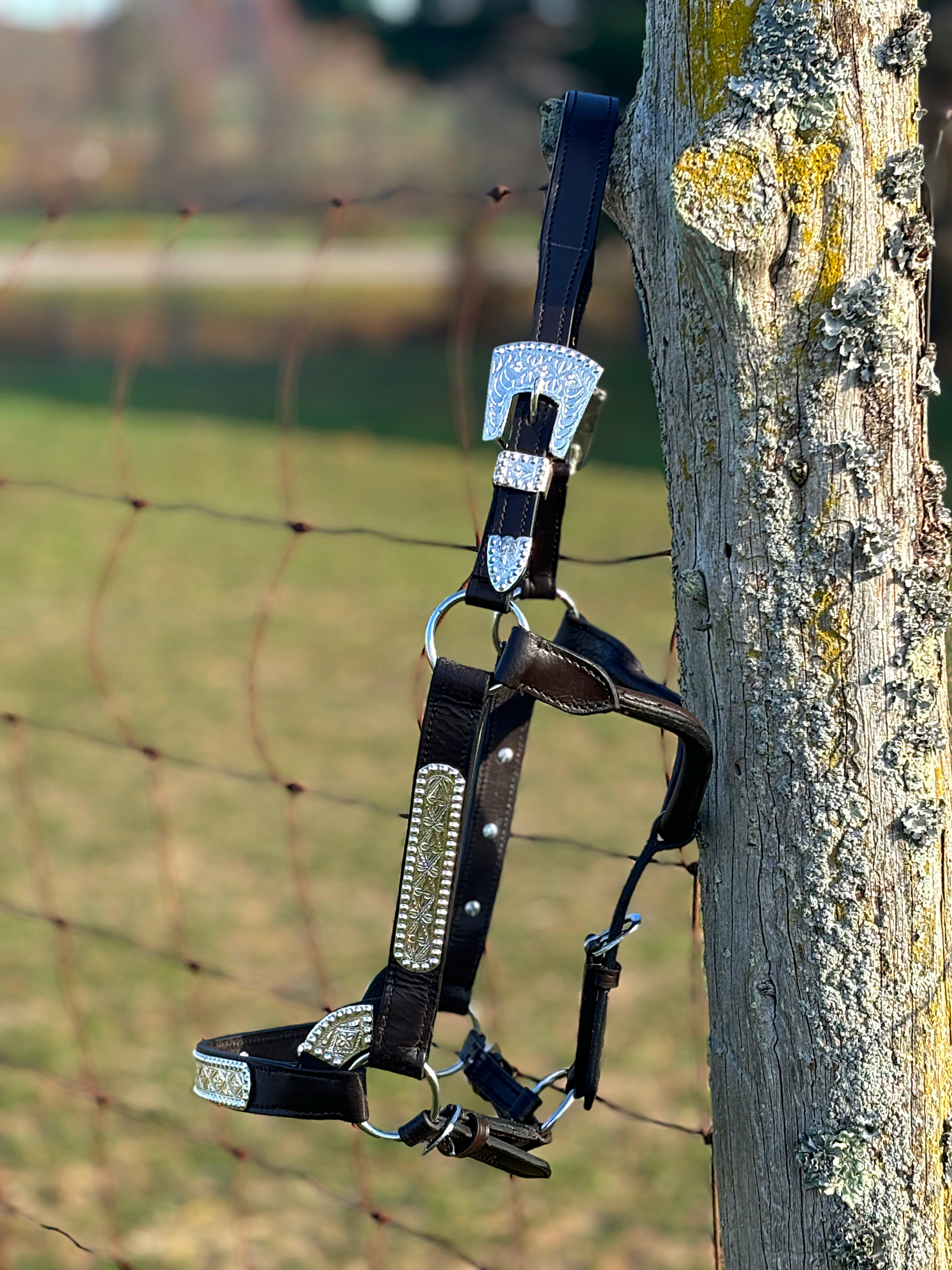 Average Horse size leather double stitched silver bar horse size show halter with 1" X 6' leather lead with stud chain. Halter features double buckles on crown and three way adjustable nose and throat latch. Dark Oil