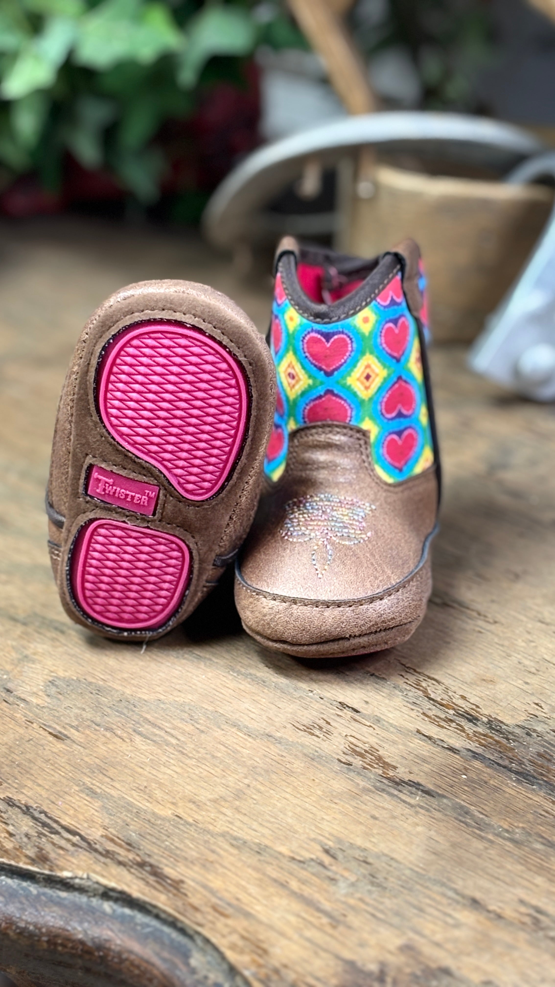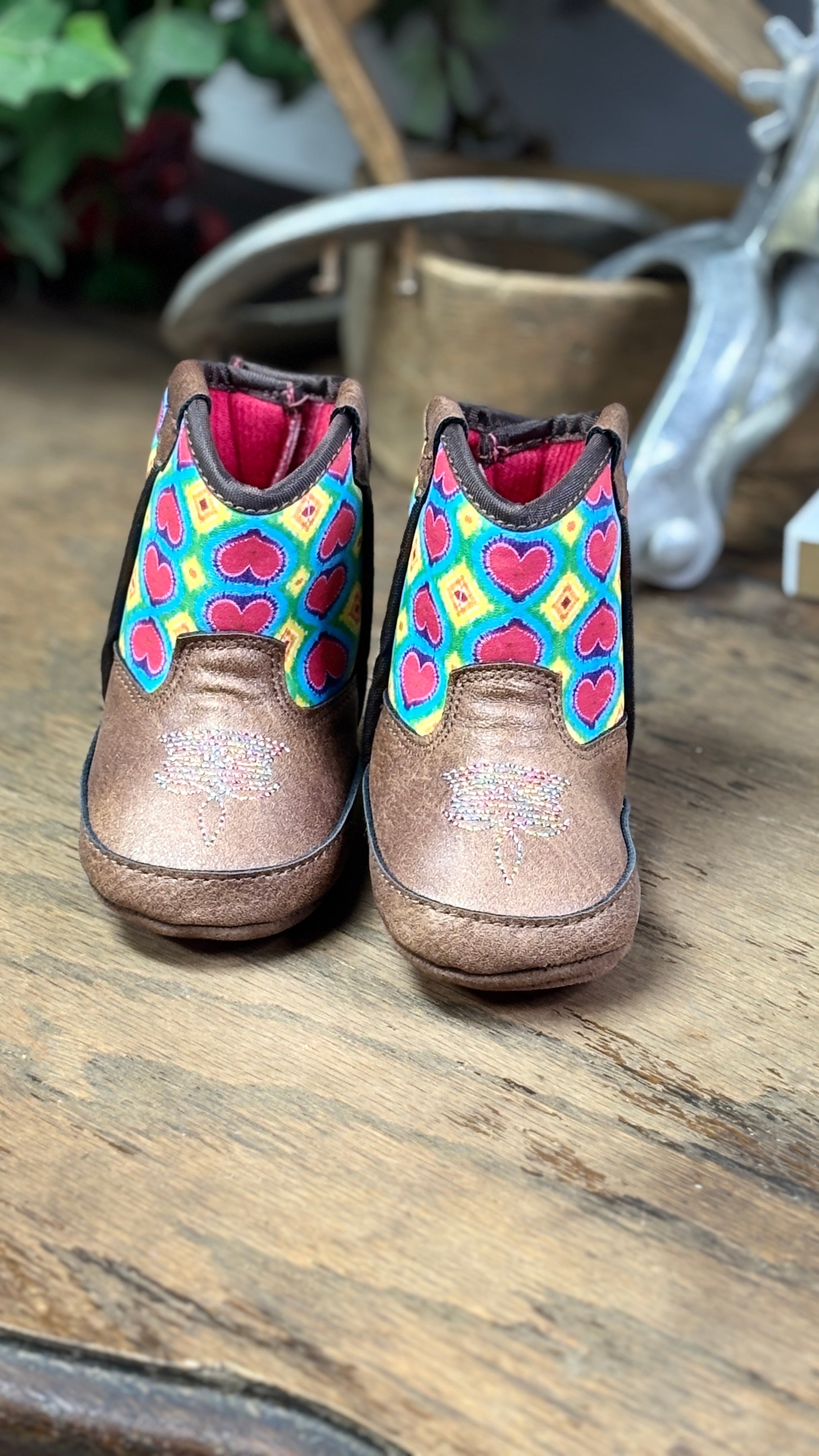Your little one is sure to be a charmer with these Abigale baby bucker boots by M&F Western Products. Brown with bright tie dye pattern on the shaft. Side Velcro closure for easy on/off.