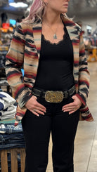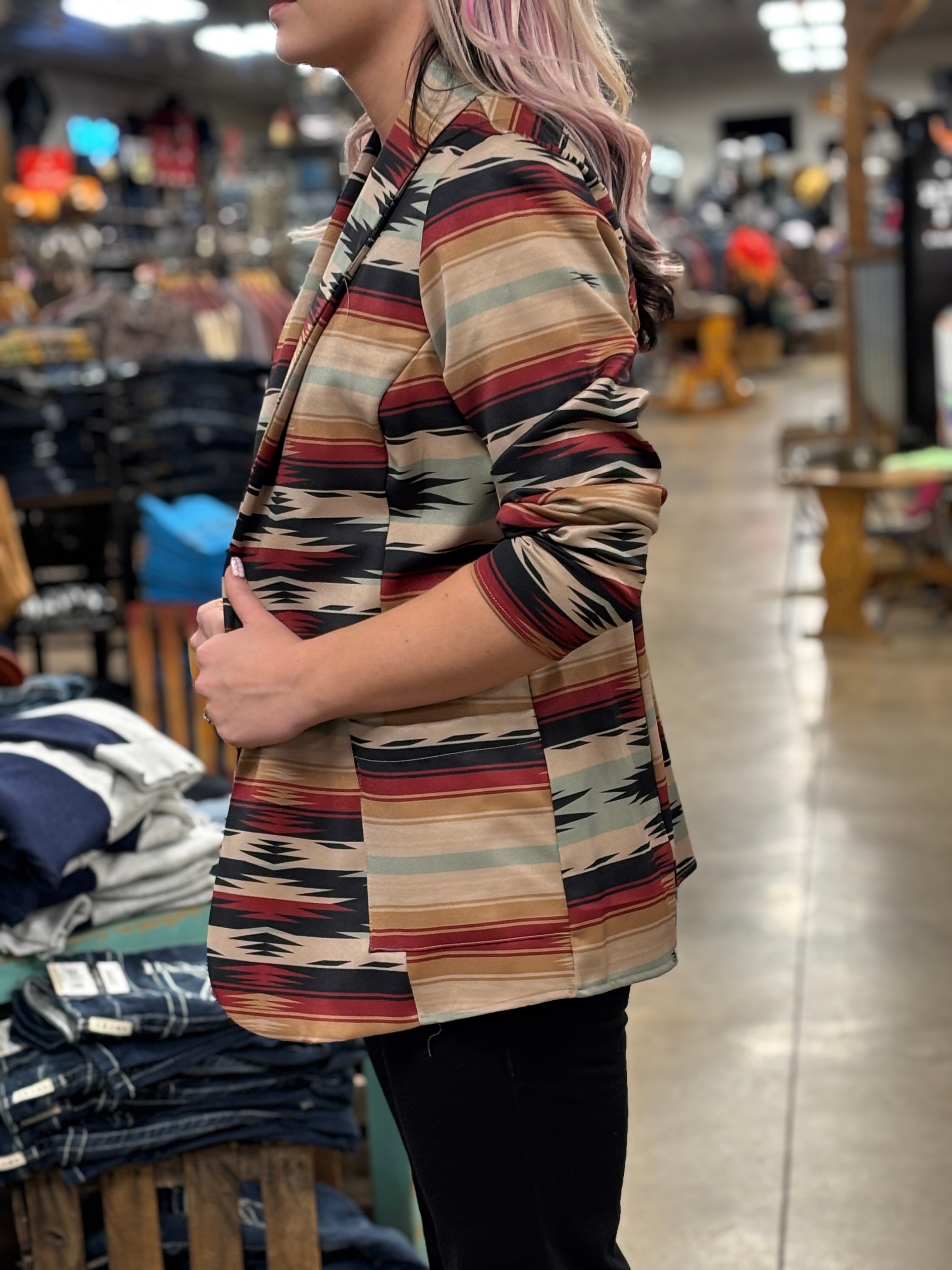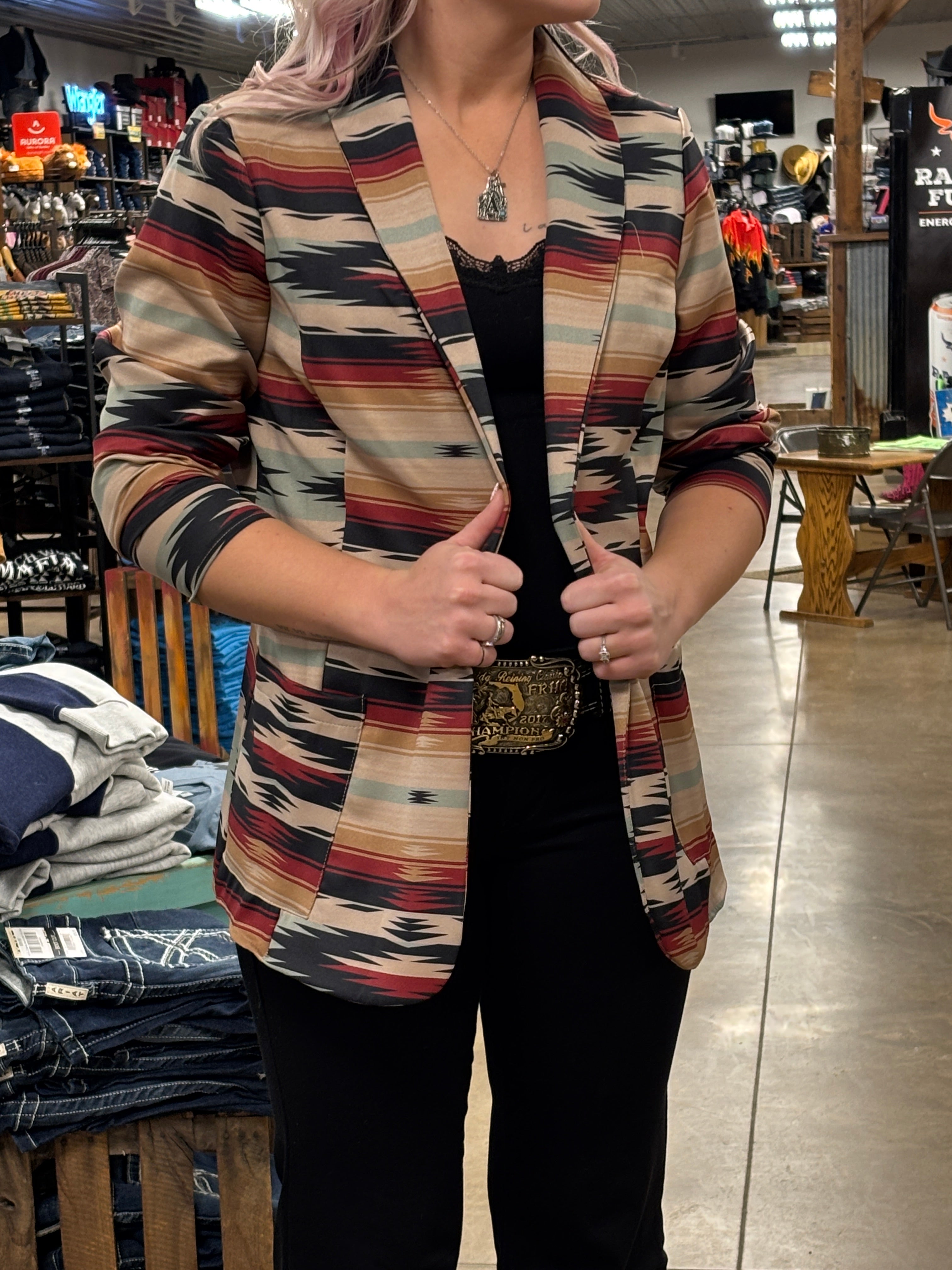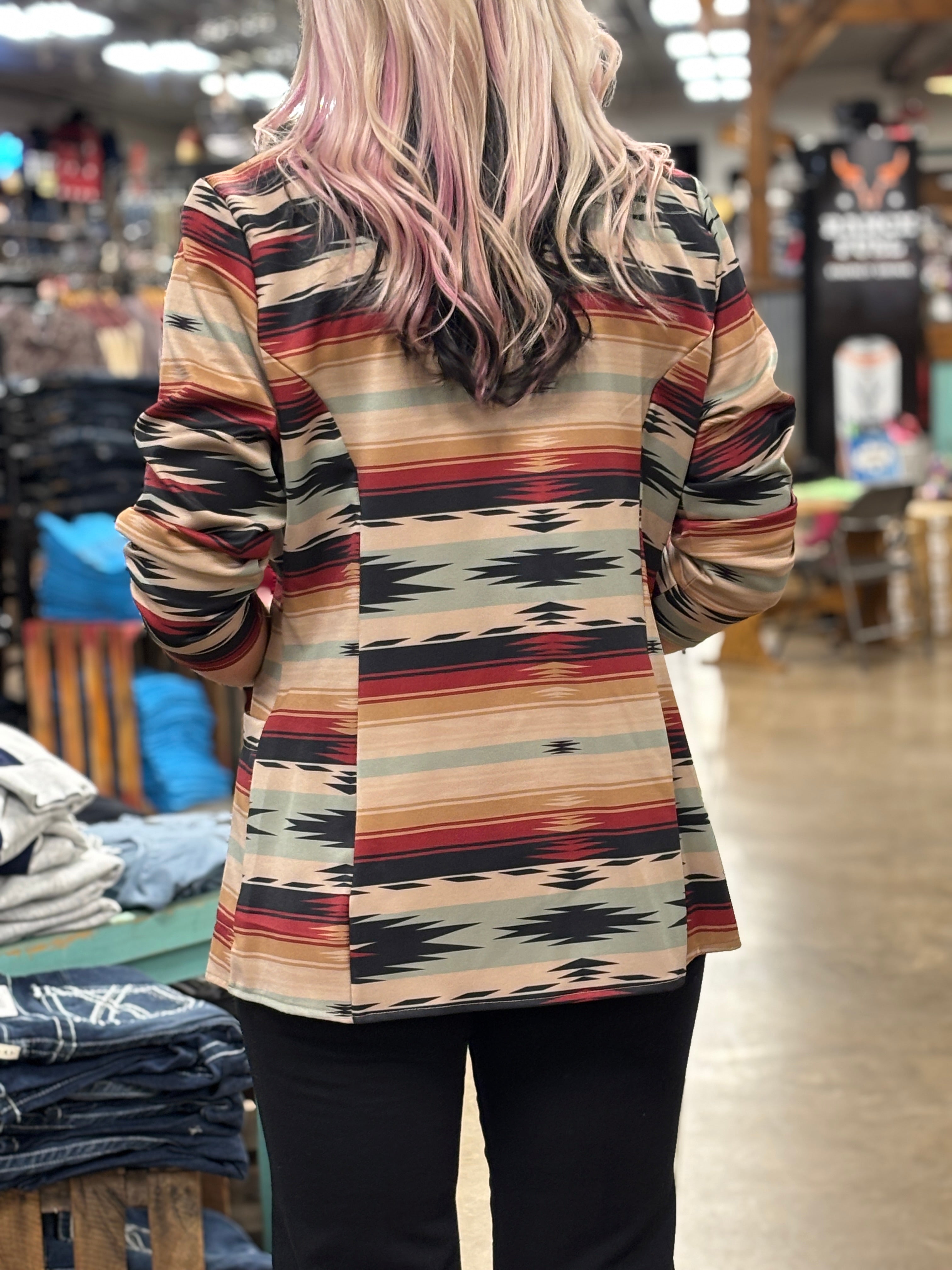 Discover the charm of Aztec print with Avery's Microfiber Blazer. Named Charlie, this blazer is not just a piece of clothing, but a statement of confidence and comfort. Designed with pockets for functionality, this blazer is an embodiment of our brand's mission - to inspire and uplift women with clothing that's more like a best friend: kind, comfortable, and supportive. Experience the love and passion we put into each piece through the vibrant colors and patterns of this blazer. true to  95% Polyester 5% Spandex