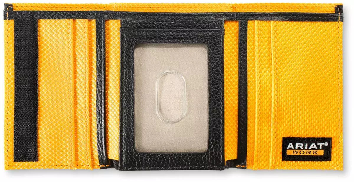 This Ariat Work trifold wallet by M&F Western Products features RFID blocking technology. Rebar orange recycled mesh interior with multiple card slots and clear PVC easy release ID window. Ariat bold graphic print. Velcro closure.