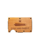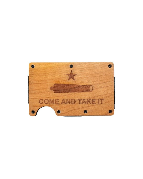 Functional and stylish, this men’s western 3D money clip and card holder wallet features a cherry wood front with a laser-engraved “COME AND TAKE IT” design, including a cannon and star motif. Equipped with RFID-blocking technology and can hold up to 12 cards. 43% Wood, 35% Aluminum, 9% Stainless Steel, 7% Carbon Fiber, 6% Elastic Band. 3D style number D250017348.