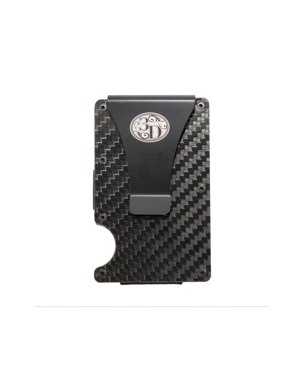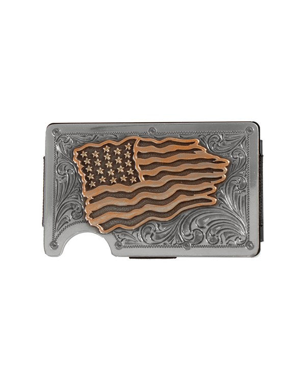 This men’s western 3D smart wallet combines style and functionality. Features a distressed copper flag on the front with an antique silver engraved scroll background. The back is finished in black carbon fiber and includes a stainless steel money clip for secure cash storage. 42% Zinc, 35% Aluminum, 10% Stainless Steel, 7% Carbon Fiber, 6% Elastic Band. 3D style number D250016897.