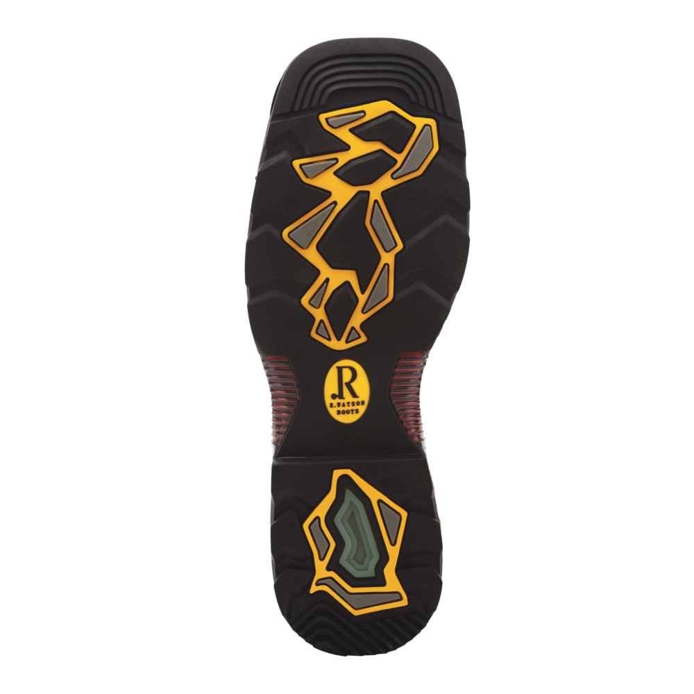 R. Watson presents these peanut cowhide and peanut cowhide lace up round toe work boots. These work boots have a removable orthotic insole, EVA midsole, and a block heel. They are EH, slip and oil resistant. 12″ total in height.