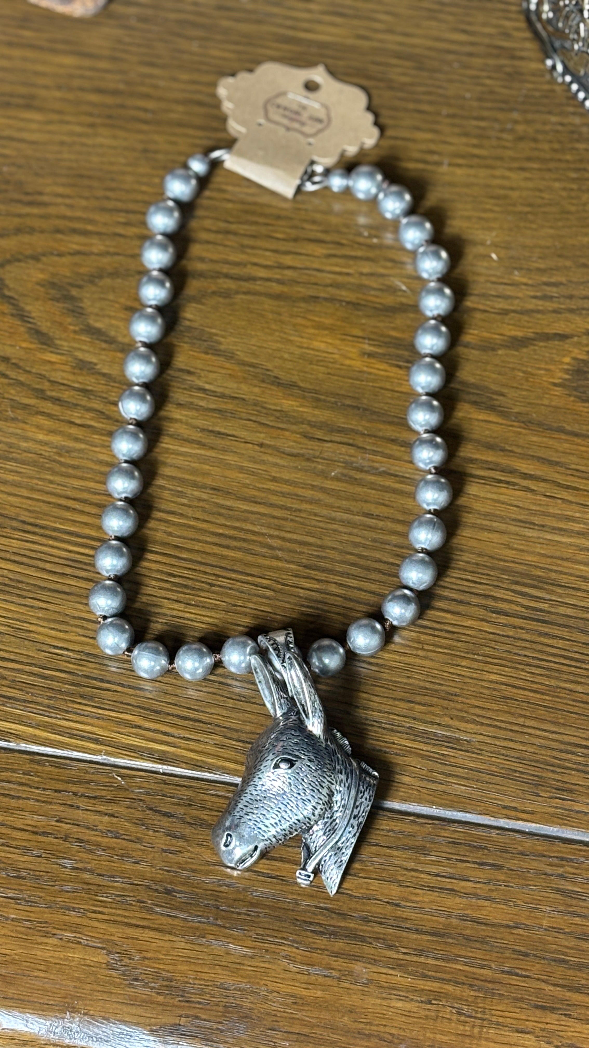 This necklace is hand knotted with 12MM silver metal beads. Pendant has a big bail with etched design on it that allows you to take it off and use it on any other strand or wear necklace by itself as a layer piece or with another pendant. Length: 20" + 3"pendant Pendant: 3" L x 2" W Bail: 0.75" bail Clasp: Lobster Claw. Note: this product isn't returnable