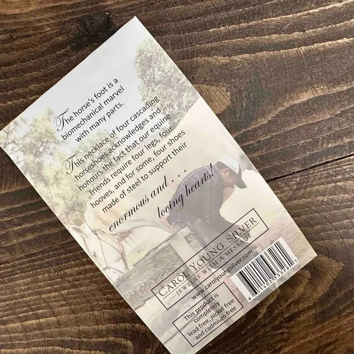 A petite version of the four, silver tone horseshoes, accented with AQUA crystals, cascade down at a slant to create a truly graceful piece of jewelry. The horseshoes hang securely from a sparkly, link chain that has a 4" extender on the back, making this necklace adjustable from 16" to 20" This necklace is packaged in a sweet card, sharing a message on the back about the loving hearts our equine friends have. As always, this product is 100% HYPOALLERGENIC