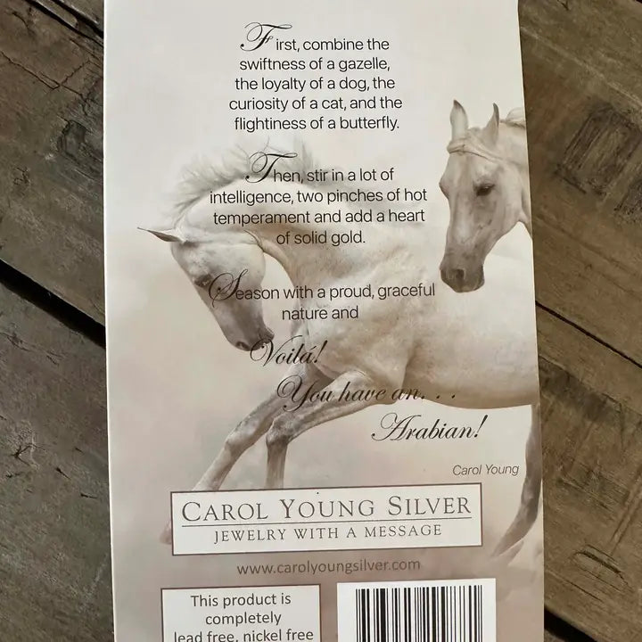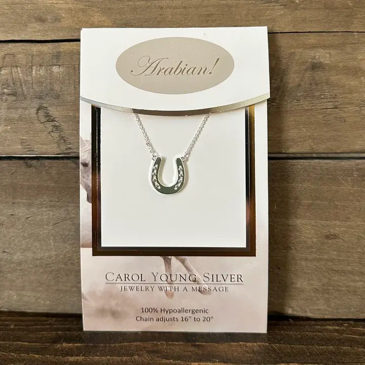 A single, silver tone horseshoe, accented with white sparkly stones (depicting the shoe nails), hangs from a sweet link chain The chain adjusts from 16" to 20" and features a classy, oval brand tag at the end. This necklace is packaged on an elegant card that subtly showcases Arabian horses. On the back of the card is a message sure to please those who appreciate and love this special breed of horse. 100% HYPOALLERGENIC