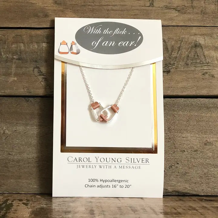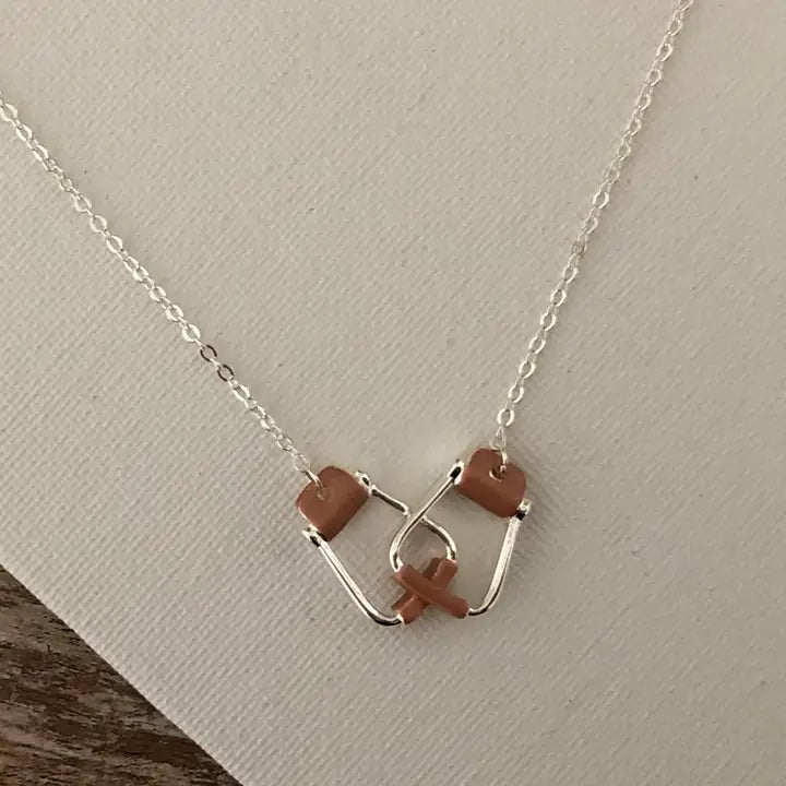 Two saddle stirrups connected with a sparkling, link chain. Show off your equestrian flair any time with this delicate hypoallergenic necklace. Saddle Stirrup necklace comes packaged on a card with a tagline "With the flick...of an ear". The chain is adjustable from 16" to 20".