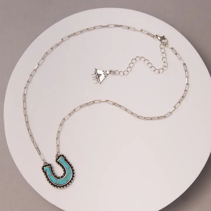 Key Features: A charming Western-inspired necklace featuring a beautifully crafted horseshoe pendant set with a luminous glass stone. The detailed metalwork and polished finish evoke rustic romance and frontier spirit, while the smooth drop silhouette adds a touch of refined elegance. Lightweight and adjustable for everyday comfort, this piece blends heartfelt symbolism with classic Western styling. Perfect For: Rodeos, country concerts, cowgirl gatherings, festivals, and daily Western wear. A thoughtful gift for country music fans, sentimental partners, collectors, and Western jewelry lovers. Ideal for boutiques, rodeo vendors, souvenir shops, and retailers seeking a sweet, versatile Western accent for any wardrobe.