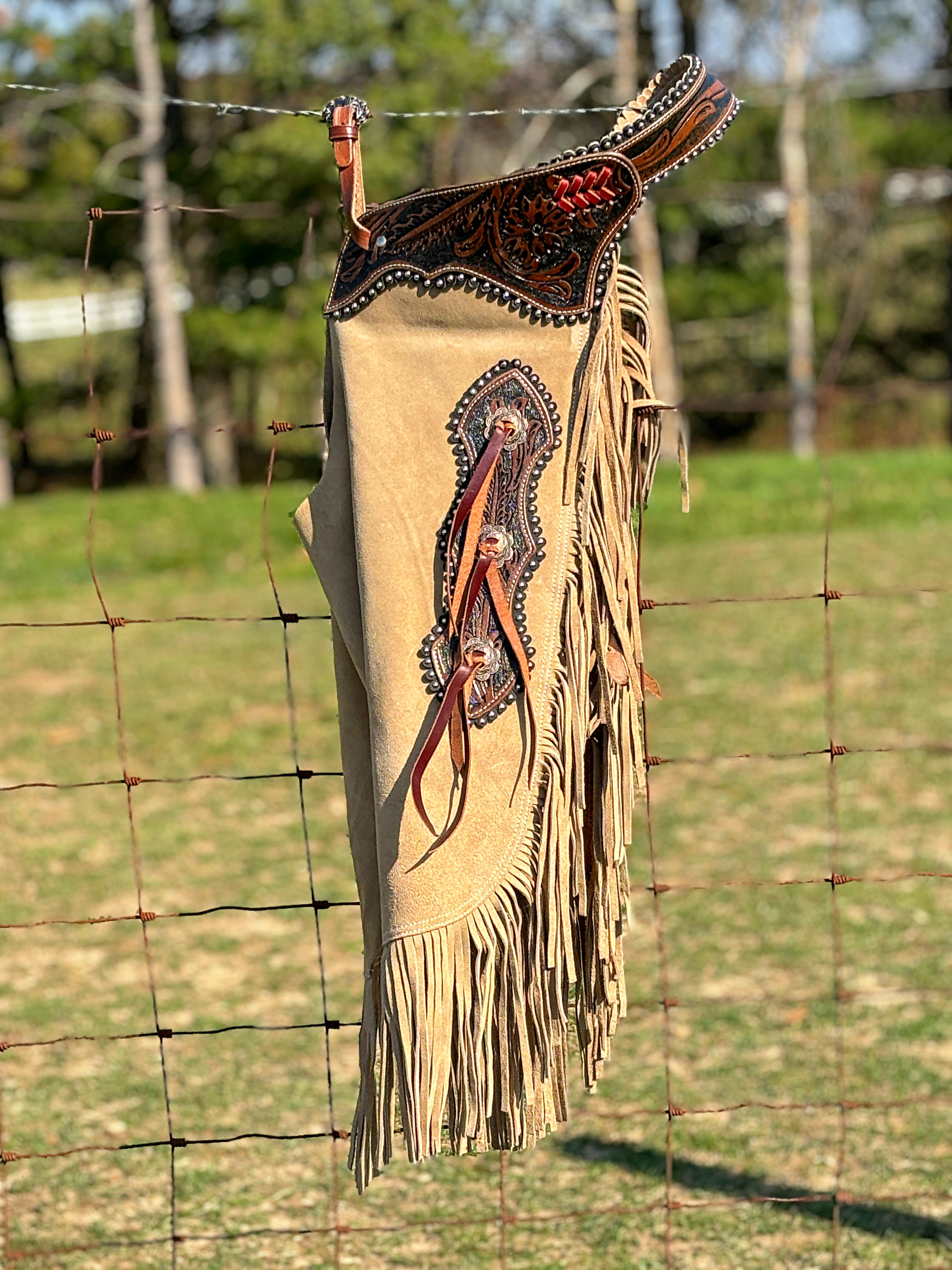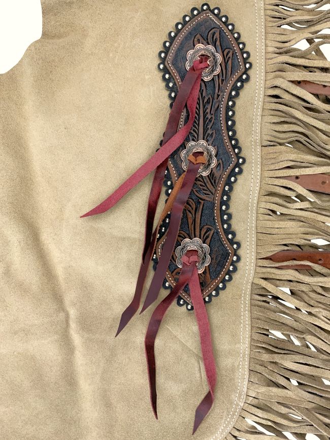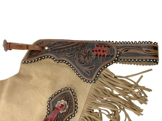 Introducing these Showman® exquisite tan chinks, crafted with the finest floral tooled leather and adorned with stylish fringe details. These chinks are designed to add a touch of Western flair to your outfit while providing functionality and durability for all your riding adventures. The adjustable buckle ensures a secure and comfortable fit, making them suitable for a wide range of sizes. Whether you're hitting the trails or performing in the rodeo arena, these brown chinks are the perfect blend of style and practicality. Elevate your equestrian wardrobe with these stunning chinks and make a statement wherever you go.