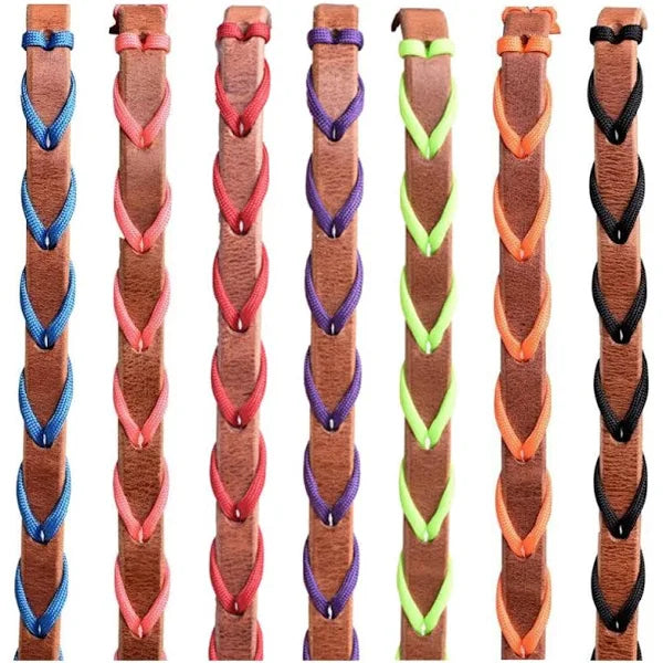 Laced Paracord Color Barrel Reins are consturcted from the finest quality hand rubbed harness leather and laced with durable and colorful paracord to coordinate with your tack. Herman Oak harness leather. Colorful paracord lace. Solid brass hardware.