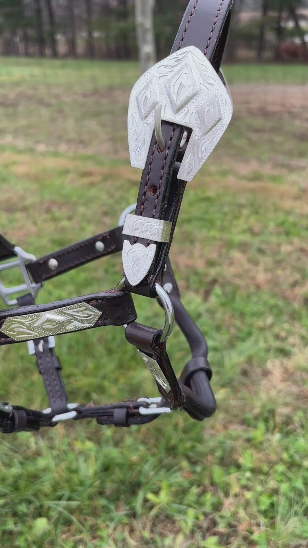 Showman ® Mini Dark leather show halter with lead. This halter features double buckles on crown and three way adjustable nose and throat latch. Halter has silver on noseband and cheeks. Comes with 3/4" x 6' leather lead with stud chain.