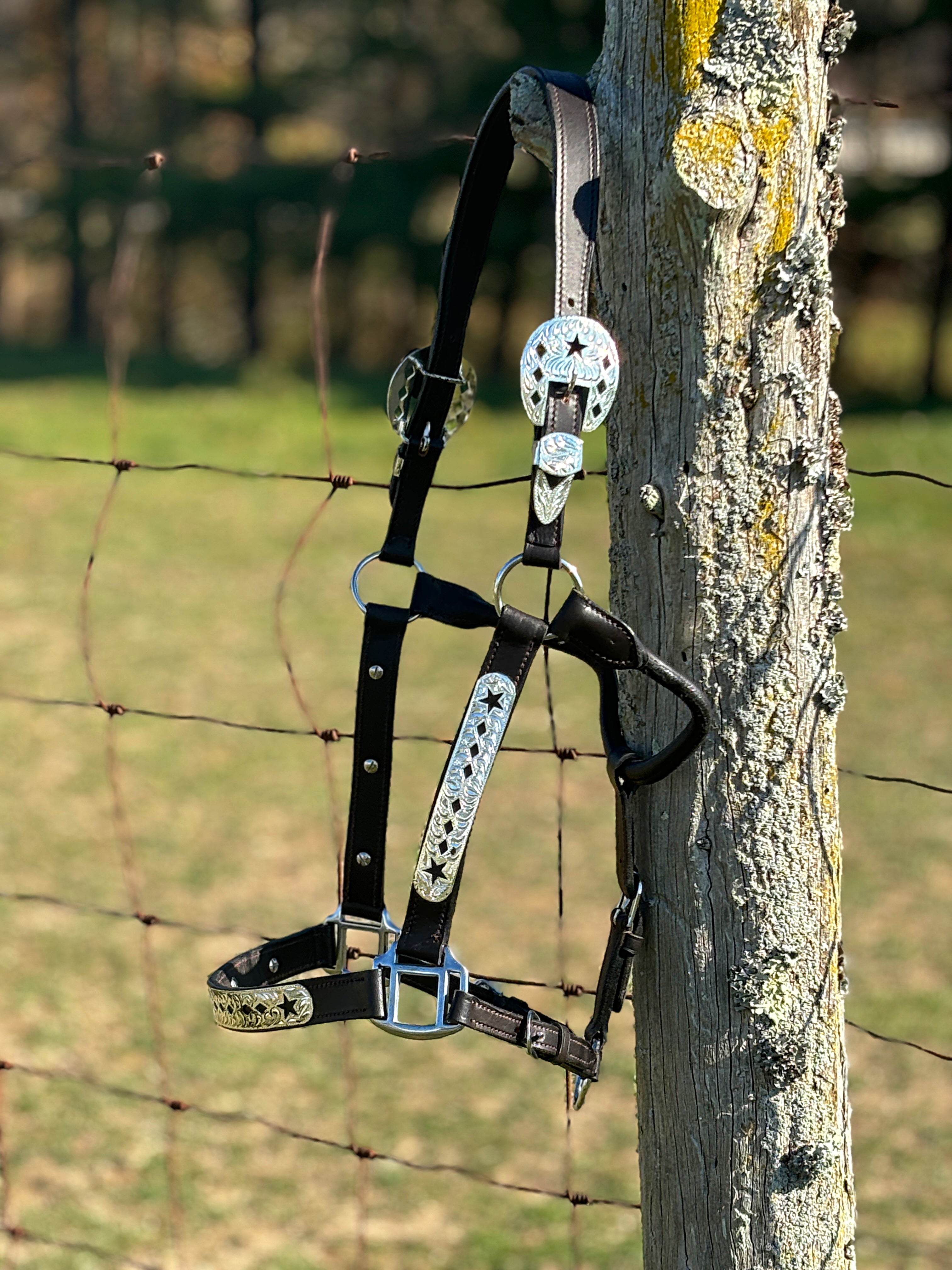 One of the most striking features of this halter is the intricate silver design that adorns it. The engraved silver bars, on the nose and cheeks, have unique star and diamond cut shapes to set this halter apart from the competition. Matching silver buckles, tips, and keepers complete this dazzling effect that will turn heads and draw attention to your horse.