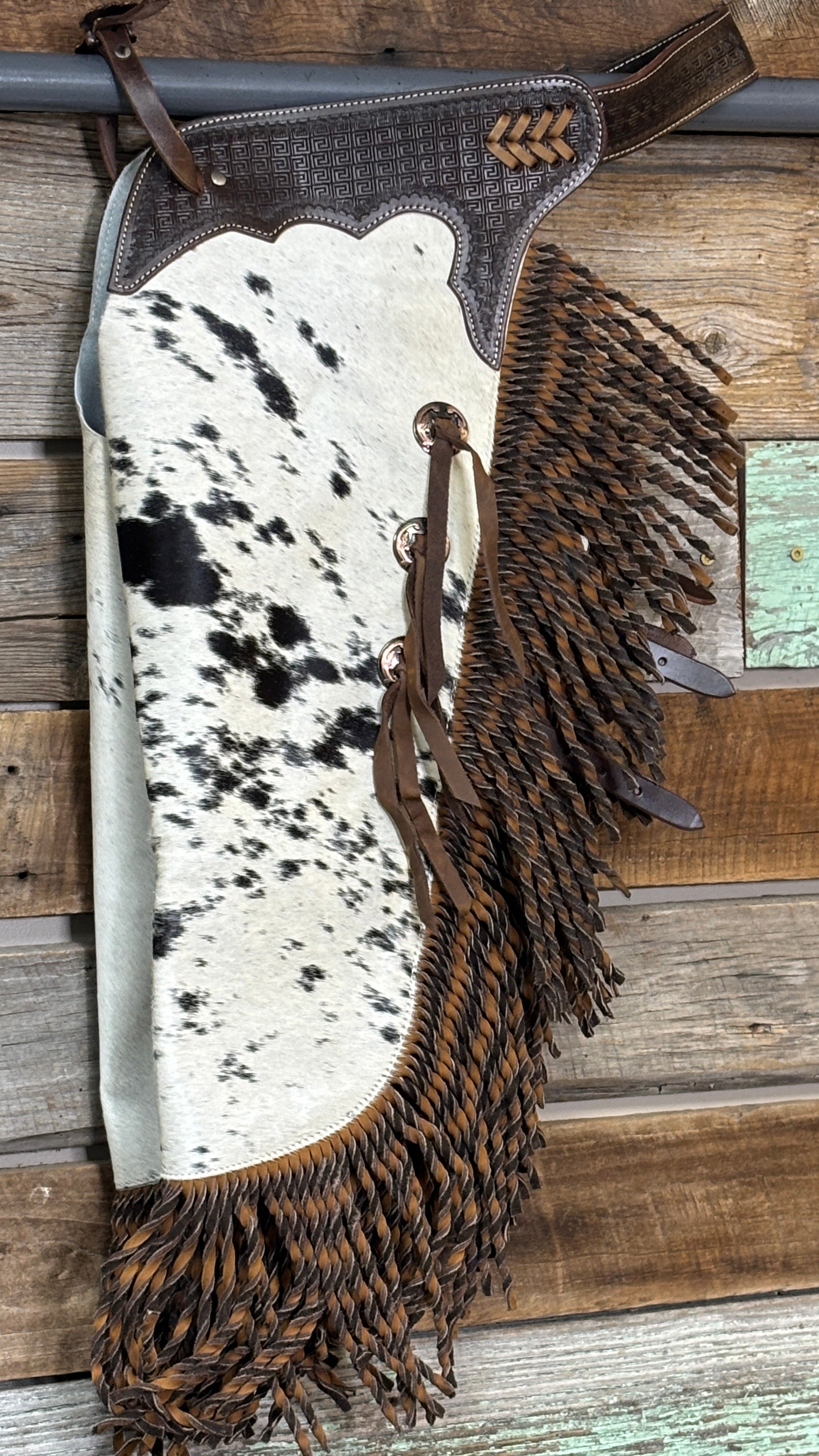 The Showman® Ranch Hand Chinks combine rugged durability with authentic Western style, making them a must-have for working cowboys and ranch riders. Crafted from premium leather with natural hair-on hide panels, these chinks feature basketweave tooled yokes and long fringe for a classic look. Adjustable buckle closures at the waist and legs ensure a secure, comfortable fit, while the open-leg design provides freedom of movement for riding and ranch work. Perfect for everyday use, rodeo events, or Western competitions, these chinks deliver both function and flair.