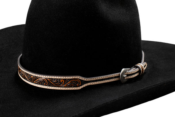 3D hatband by M&F Western Products. Tan leather that has a beautiful brown scrolling design embossed down the body. The look is completed with an antique silver finish buckle with scrolling design.