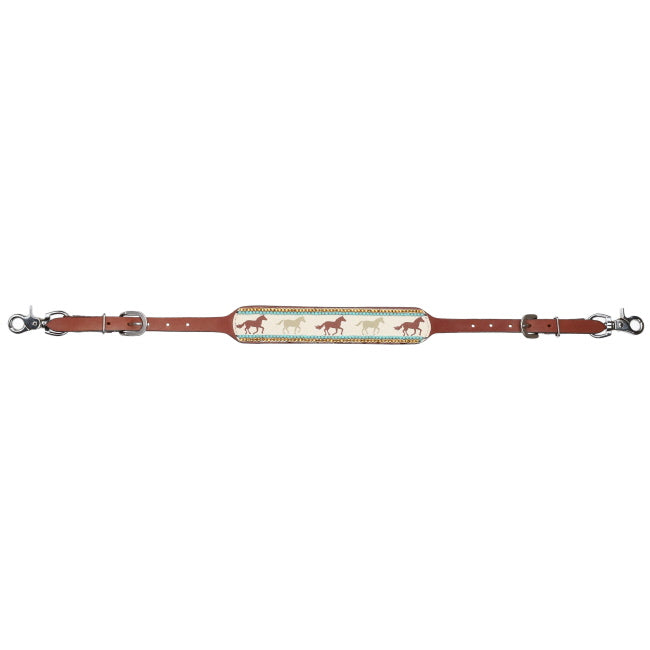 Crafted from rich medium oiled leather, this wither strap features eye-catching Southwestern Running Horse print inlays that combine the spirit of the wild with vibrant tribal flair. Galloping horses, striking patterns, and rustic tones come together to create a look that stands out in the arena or on the trail.