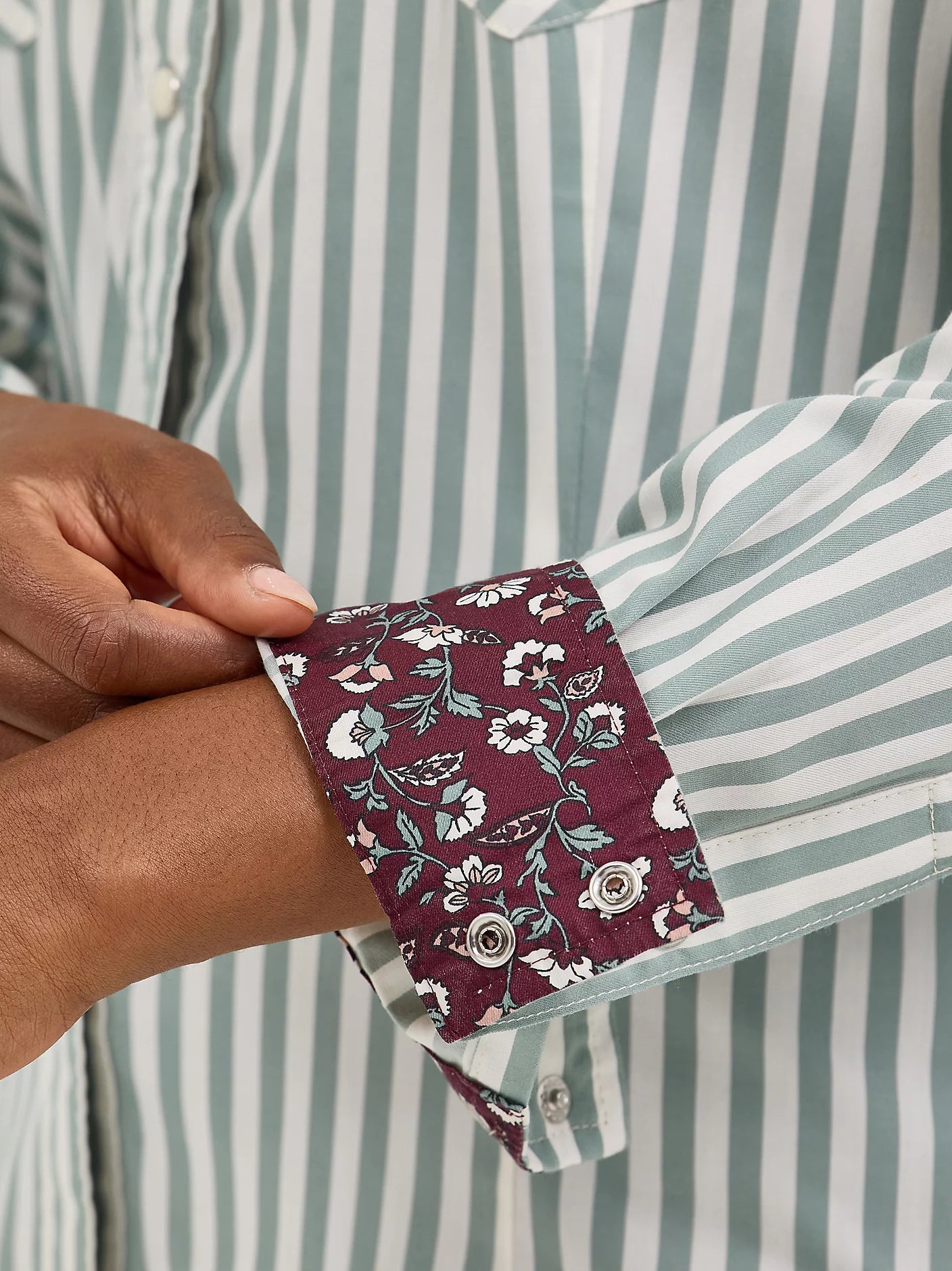 A cowgirl can never have too many collared shirts for competition and daily life. Our Women's Wrangler Retro® All-Occasion Western Snap Dress Shirt is crafted a lightweight cotton and recycled materials blend that will keep you comfortable in everything you do. It comes with pointed yokes, pearl snaps, two chest pockets with the signature "W" stitching, and a contrast print at the cuffs.