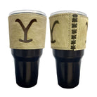 30 oz Insulated Black Tumbler with Removable Argentina Cow Leather Cowhide 'Y' Brand Sleeve. This insulated tumbler with lid features an Argentina Cow leather removable sleeve. This sleeve features a hair on cowhide with 'Y' cattle brand diamond pattern with hair on cowhide inlay.