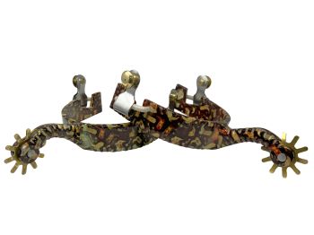 These spurs are sure to delight any rider who uses them. The spurs feature a 10-point rowel and boot overlay pattern on the band. Spurs are accented with bright brass rowels and buttons. These spurs can easily be attached to spur straps and will fit most boot sizes.